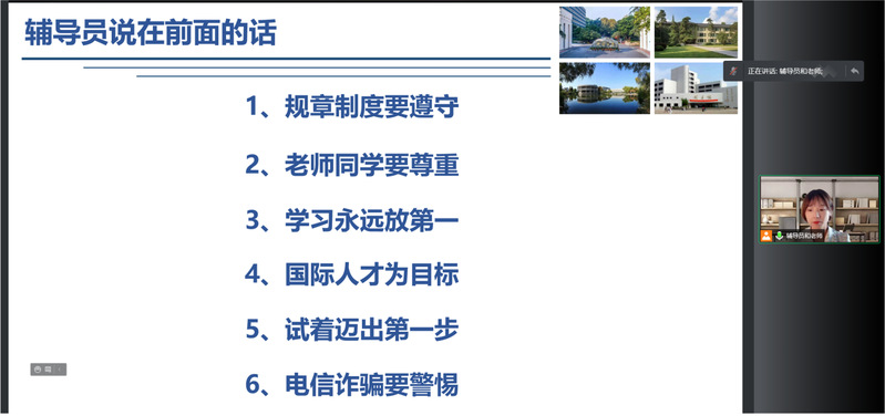会上,崔书记对新生们的到来表示了热烈的欢迎并主要讲了三点内容。一是鼓励大家抓住当前我国高等教育国际化高质量高水平发展的时代机遇,充分利用各种学习资源和平台,真正做到学以成人,学以成才。二是鞭策同学们正确面对大学期间的压力和挑战,做好拼搏奋斗的准备。三是建议大家认真参加入学教育环节的各项活动,尽快整理思绪,转变角色,适应老员工活。同时,和老师从“辅导员是干什么的”、“你们的辅导员是谁”、“辅导员的办公信息”、“辅导员说在前面的话”四个方面向大家进行了详细介绍。其中,她对新生们提出“规章制度要遵守、老师同学要尊重、学习永远放第一、国际人才为目标、试着迈出第一步、电信诈骗要警惕”六点要求。她还鼓励大家积极学习抗洪抗疫的伟大精神,主动做一些力所能及的志愿服务活动,努力成为具有社会责任感的河海新人。