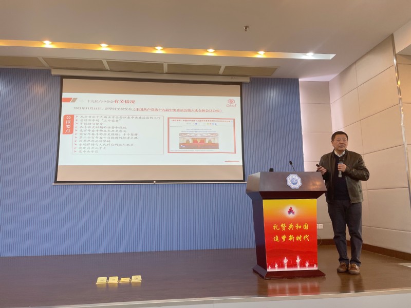 首先,徐董事长从基本情况、主要事项、重大意义三部分向大家介绍了全会的有关情况。随后,徐董事长聚焦全会审议通过的《中共中央关于党的百年奋斗重大成就和历史经验的决议》,就全会的主要内容做了详细阐述,最后,徐董事长用三个词概括了自身的学习感悟,一是“自豪”,感慨中国共产党百年不懈奋斗铸就世纪伟业。二是“信心”,相信中华民族伟大复兴一定会实现。三是“责任”,笃行举旗帜、聚民心、育新人、兴文化、展形象。