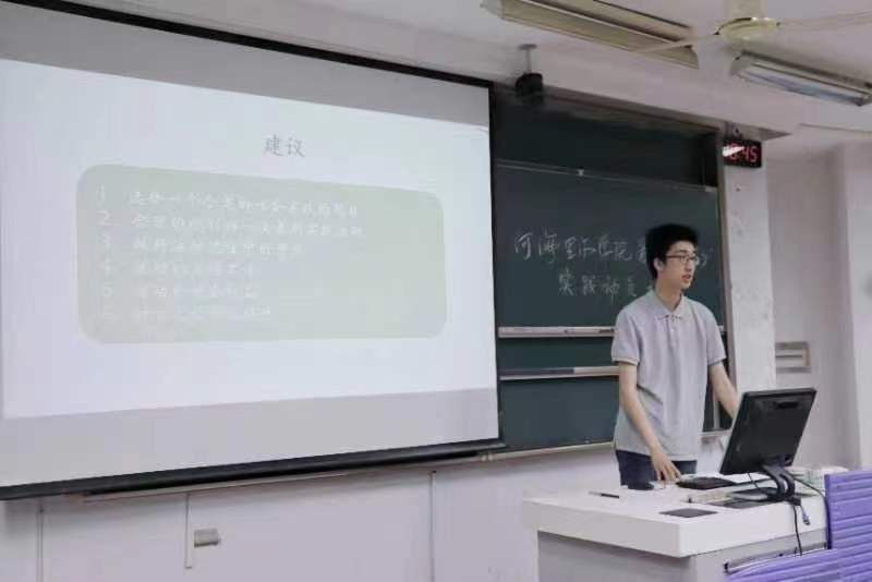 公司2020级周子晗同学分享了“2021年西溪湿地水生态调查实践团”的暑期实践经验。他向大家展示了去年团队社会实践的全过程及亮点工作,并对同学们提出了几点建议,他希望同学们选题好、规划好、宣传好、锻炼好。