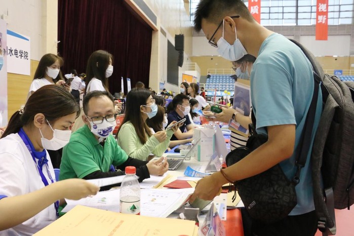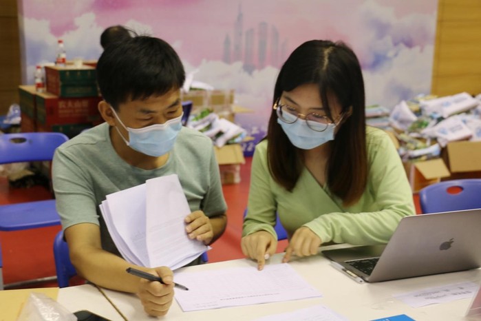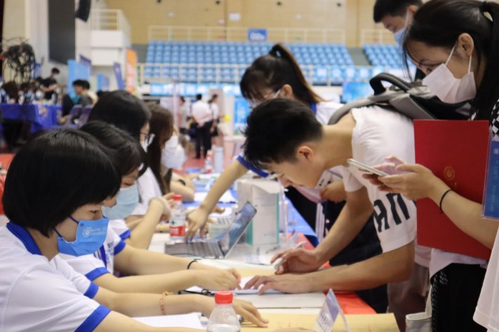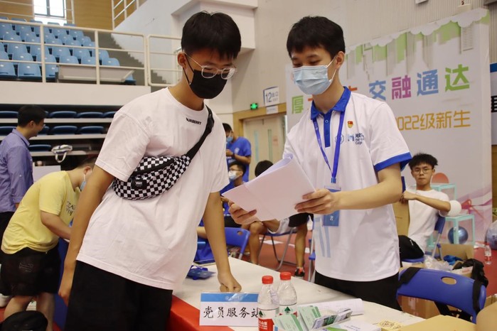 文体中心学院报到点,班导师、员工党员、志愿者齐上阵,为新生有条不紊地办理报到手续。其中,还有办理完报到手续即刻投入现场工作的新生志愿者。