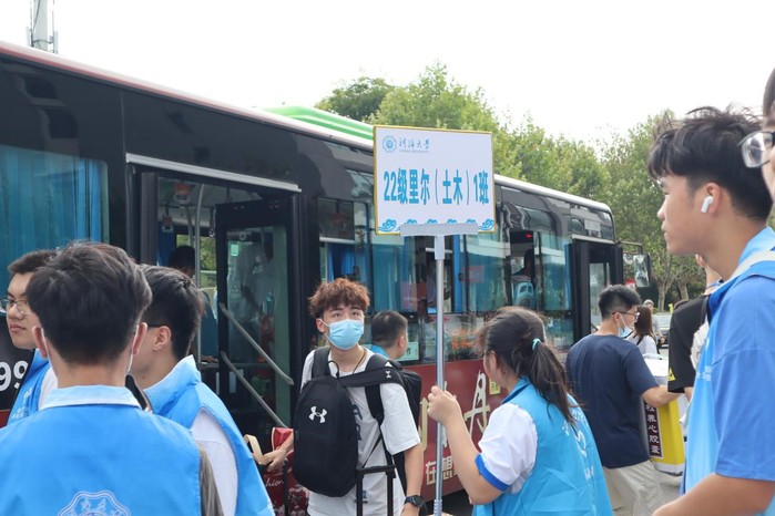 沉重的行李拖不住轻快的脚步,旅途的劳累拦不住欢欣鼓舞。在南门志愿者的积极引导和热情服务下,新生们有序排队,坐上摆渡车抵达宿舍,开启小海狸之“旅”。