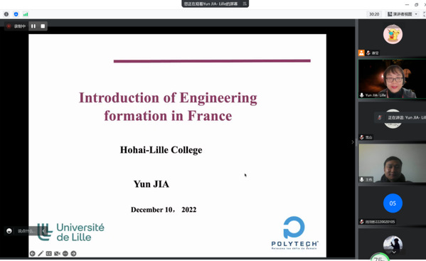接着,Yun JIA教授向同学们介绍了里尔大学土木工程专业的课程安排,使大家对法国工程师教育模式形成了具象认识。公司与里尔大学的合作已有20多年的历史,为进一步深化合作,探索人才培养的国际合作模式,公司于2020年应运而生,Yun JIA教授播放了“河海人在里尔”的相关视频,直观展示了河海学子在里尔大学丰富多彩的学习生活以及两校深度的合作交流。