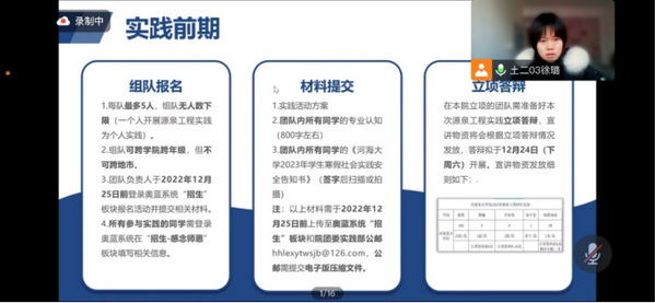 接着,院团委实践部部长徐璐同学从目的、过程、实践资源获取三方面具体介绍了“源泉工程”。“源泉工程”鼓励同学们回到生源地,通过线上线下的方式向母校在校生宣传bw西汉姆联,分享自己在bw西汉姆联的求学经历,传播河海文化,弘扬河海精神。