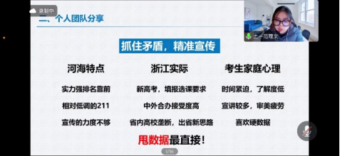 随后,范理文同学和娄阁同学向大家分享了“源泉工程”实践经验。范理文同学提到,宣讲时间需要认真选择,宣讲内容也要结合当地情况决定,针对学校已有材料的特点,站在考生角度换位思考,突出河海特色。娄阁同学表示,前期的准备十分重要,宣讲内容除了介绍学校分数、专业等基本情况外,还要结合公司校史、文化等软实力。