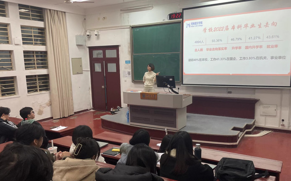 首先,通过梳理学校本科毕业条件和学士学位授予条件,和老师提醒大家主动对标要求,及时在学分绩点、英语成绩、PU学时等方面查漏补缺。之后,和老师结合真实数据,系统分析了“就业”“读研”“出国”三方面的相关形势和信息渠道,并就本院和本校的考研保研条件进行了详细介绍。另外,和老师与大家分享了自身的考研、就业经历,再次强调了“客观的分析、全力的准备、不错的心态”的重要性。最后,和老师就寒假工作安排和下学期工作重点进行了详细说明,引导同学们充分利用寒假全面分析、客观决策、尽早准备。