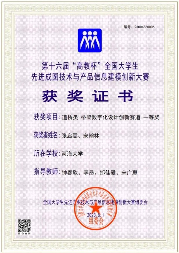 2023.8,第十六届“高教杯”全国老员工先进成图技术与产品信息建模创新大赛道桥类桥梁数字化设计创新赛道一等奖、团体二等奖