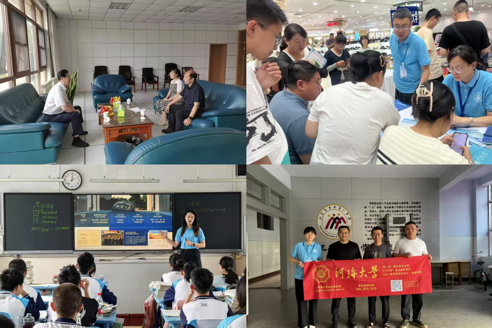 左上图:与重点中学老师交流 左下图:向高三员工宣传bw西汉姆联 右上图:高招会现场接待咨询 右下图:走访重点中学