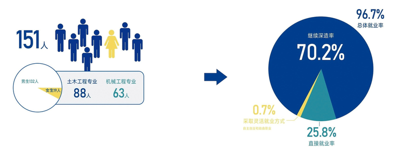 截至2024年12月31日,2024届(首届)151名本科毕业生中升学106人(占比70%),其中54人被国(境)外知名高校录取,包含20所QS排名世界前50学校(卡内基梅隆大学、约翰霍普金斯大学、加州大学伯克利分校、帝国理工学院、新加坡国立大学、香港大学等);国内高校和科研院所升学52人,其中,985高校录取20人,211高校及科研院所录取32人(包含进入学院“本硕(工程师)”一体化人才培养项目员工)。直接就业45人,主要去向为考公、考编、选调、国内外知名企业(如中国中铁、中建集团、中国中冶、比亚迪、东风汽车等集团或公司)、自主创业等。